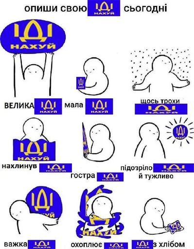 Стикеры «ІДІ НАХУЙ» относятся к тегам статичных стикеров, стикеры. Попробуйте посмотреть другие стикеры по этим тегам.